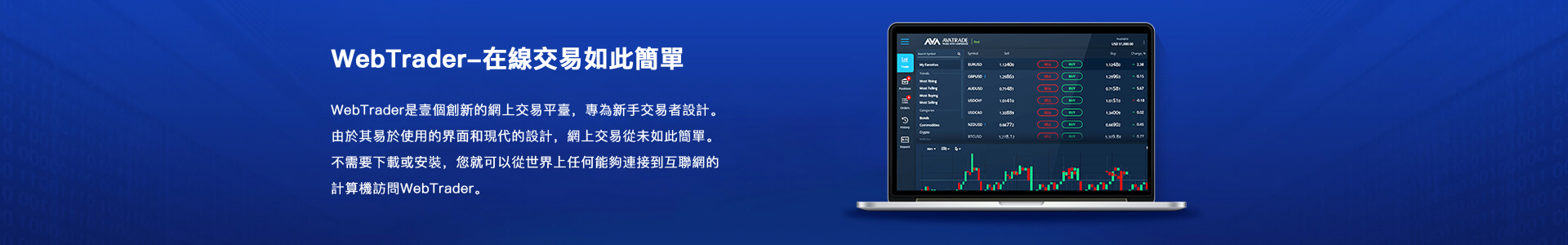 WebTrader是AvaTrade專業團隊自主研發的網頁版交易平臺,簡潔美觀的設計,人性化的界面,更適合初入交易市場的新手。同時它也兼備了AvaTrade Protect保障計劃,以及Trading Central專業的第三方交易觀點,內嵌式新聞和行情趨勢預測,輔助每一個交易者樹立交易信心。WebTrader 不受任何軟件的限製,無論您在何地,只需有瀏覽器,即可交易。